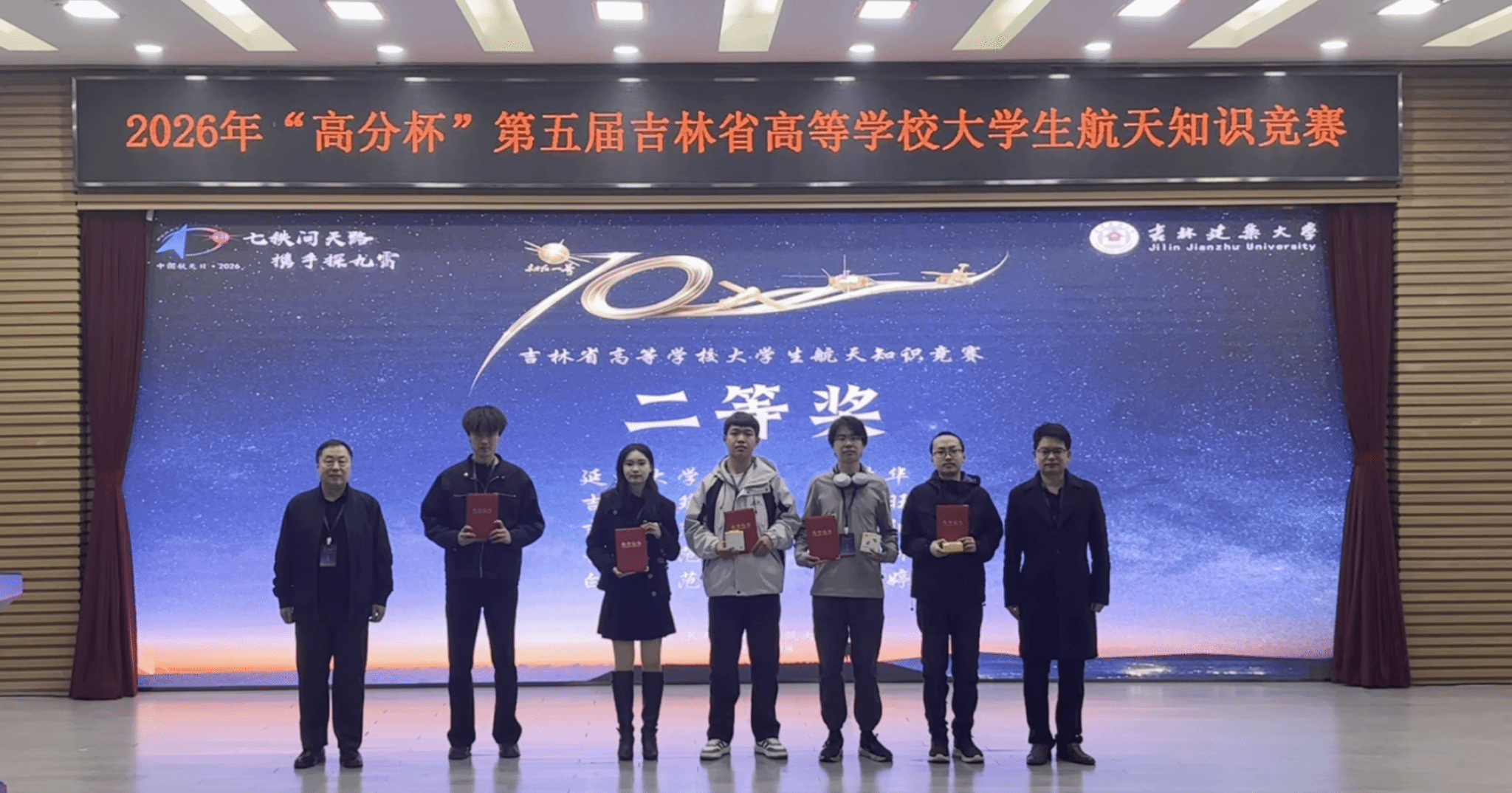本项赛事已被正式列入吉林省普通本科高校大学生学科竞赛名单,共吸引了来自吉林大学、延边大学、吉林师范大学等省内17所高校的475名选手报名参赛,经过预赛和半决赛角逐,8位选手最终进入决赛。在决赛现场,经过必答题和抢答题竞赛环节,吉林大学斯率获特等奖,北华大学周芳旭、通化师范学院刘润雅荣获一等奖,延边大学文浩华、吉林建筑大学廖佳旺、吉林师范大学唐旭阳、长春师范大学薛知林、白城师范学院顾婷荣获二等奖,延边大学于彤等10人荣获三等奖,延边大学于宛玉等18人获优秀奖。此次活动中,我院学子表现优异,共获得二等奖一项、三等奖两项、优秀奖一项,充分彰显了学院在航天相关学科人才培养中的成效,也体现了学院在学生学科竞赛指导中的扎实工作。